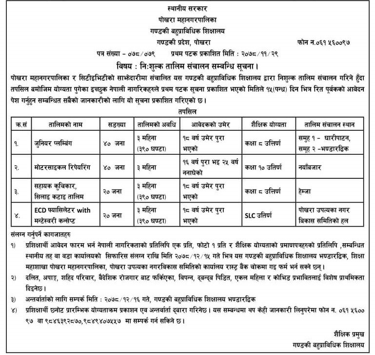एव अन्तर्वार्ता द्बारा गरिनेछ । यस सम्बन्धमा थप केही जानकारी लिनुपरेमा फोन न. ०६१‑५६००९७ वा ९८४६३९२८७०,९८४९४०७५५७ मा सम्पर्क गर्न सकिने छ ।