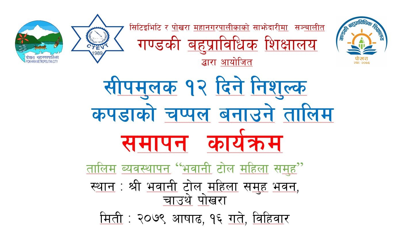 पोखरा महानगरले संचालन गरेको गण्डकी बहुप्राविधिक शिक्षालयको आयोजनामा पोखरा महानगरपालिका वडा न-१४ चाउथे, भवानी टोल महिला समुहको हलमा २०७९/०३/०४ गते बाट सुरु भएको १२ दिने कपडाको चप्पल बनाउने तालिम २०७९/०३/१६ गते एक कार्यक्रमका बीच समापन भएको छ | शिक्षालयको स्वीकृत पाठ्यक्रममको अधिनमा रही ६० घण्टा सम्म संचालन गर्ने तालिममा २० जना सहभागी रहेका थिए |