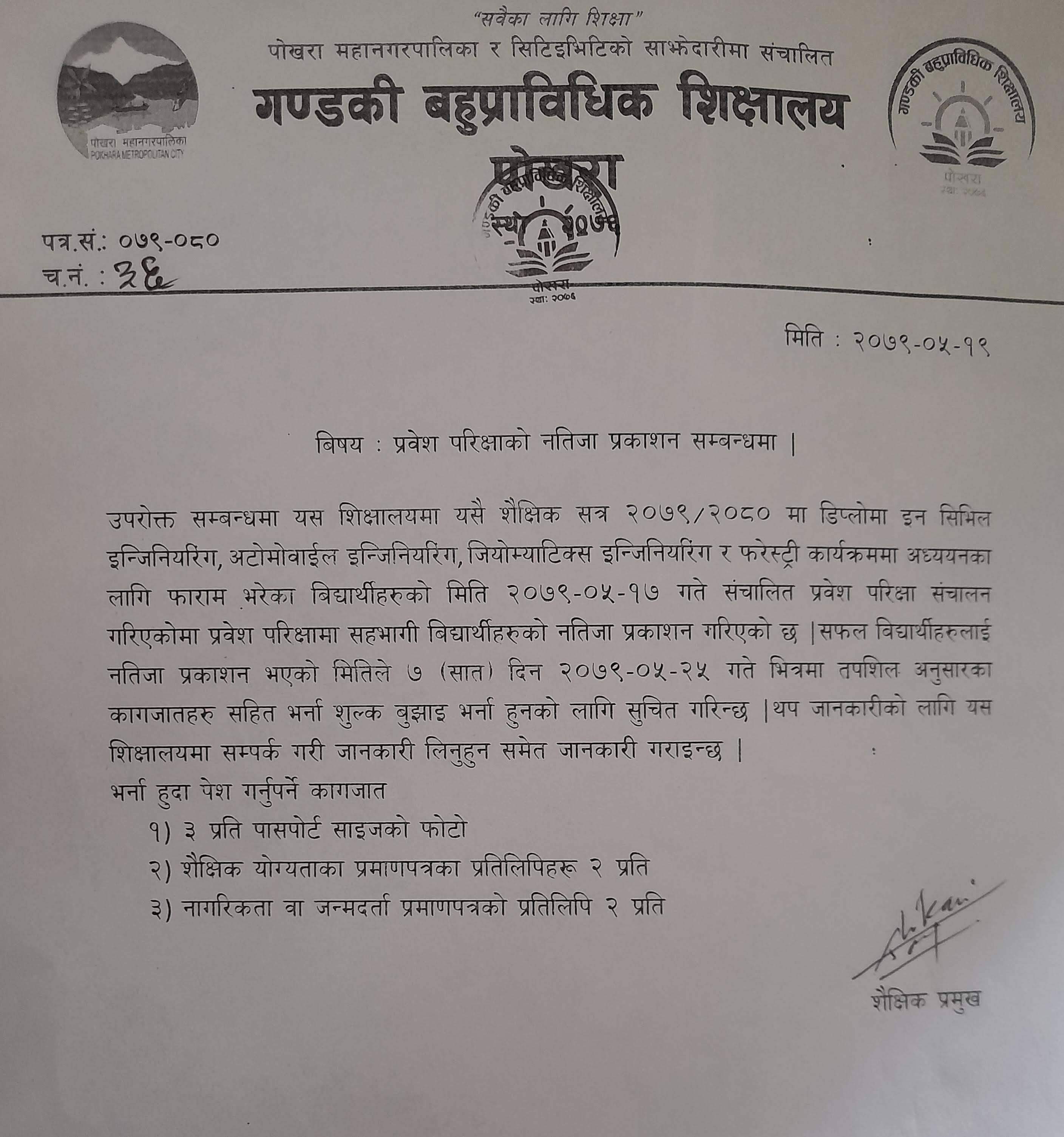 उपरोक्त सम्बन्धमा यस शिक्षालयमा यसै शैक्षिक सत्र २०७९/२०८० मा डिप्लोमा इन सिभिल इन्जिनियरिंग ,अटोमोवाईल इन्जिनियरिंग ,जियोम्याटिक्स इन्जिनियरिंग र फरेस्ट्री कार्यक्रममा अध्ययनका लागि फाराम भरेका बिद्यार्थीहरुको मिति २०७९-०५-१७ गते संचालित प्रवेश परिक्षा संचालन गरिएकोमा प्रवेश परिक्षामा सहभागी बिद्यार्थीहरुको नतिजा प्रकाशन गरिएको छ |सफल बिद्यार्थीहरुलाई नतिजा प्रकाशन भएको मितिले ७ (सात) दिन २०७९-०५-२५ गते भित्रमा तपशिल अनुसारका कागजातहरु सहित भर्ना शुल्क बुझाइ भर्ना हुनको लागि सुचित गरिन्छ |थप जानकारीको लागि यस शिक्षालयमा सम्पर्क गरी जानकारी लिनुहुन समेत जानकारी गराइन्छ |