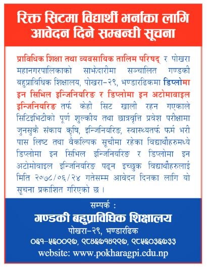 · यस गण्डकी बहुप्राविधिक शिक्षालयमा भर्ना गर्नको लागि डिप्लोमा इन सिभिल इन्जिनियरिंग र डिप्लोमा इन अटोमोवाइल इन्जिनियरिंग तर्फ केहि सिट रिक्त रहेकाले सिटीइभिटी प्रदेश कार्यालयले प्रकाशन गरेको नतिजामा बैकल्पिक तथा पास लिस्टमा रहनुभएका बिधार्थिहरुलाई भर्ना हुनको लागि मिति २०७८/०६/२४ गते कार्यालय समय सम्म निवेदन दिनुहुन अनुरोध छ |