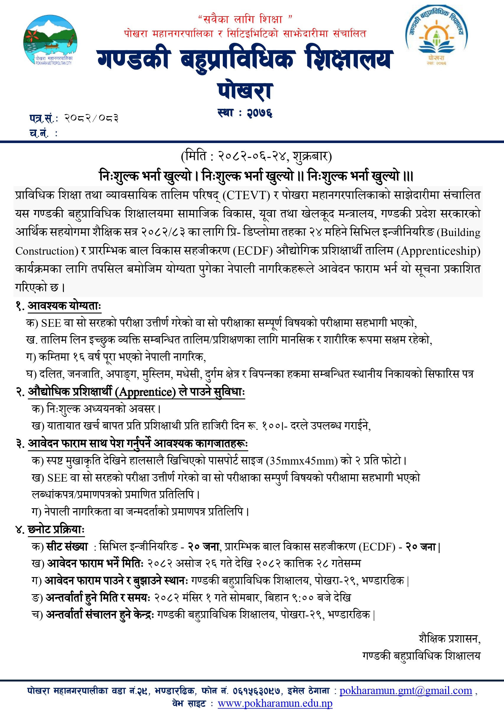प्राविधिक शिक्षा तथा व्यावसायिक तालिम परिषद् (CTEVT) र पोखरा महानगरपालिकाको साझेदारीमा संचालित यस गण्डकी बहुप्राविधिक शिक्षालयमा सामाजिक विकास, यूवा तथा खेलकूद मन्त्रालय, गण्डकी प्रदेश सरकारको आर्थिक सहयोगमा शैक्षिक सत्र २०८२/८३ का लागि प्रि- डिप्लोमा तहका २४ महिने सिभिल इन्जीनियरिङ (Building Construction) र प्रारम्भिक बाल विकास सहजीकरण (ECDF) औद्योगिक प्रशिक्षार्थी तालिम (Apprenticeship) कार्यक्रमका लागि तपसिल बमोजिम योग्यता पुगेका नेपाली नागरिकहरूले आवेदन फाराम भर्न यो सूचना प्रकाशित गरिएको छ |